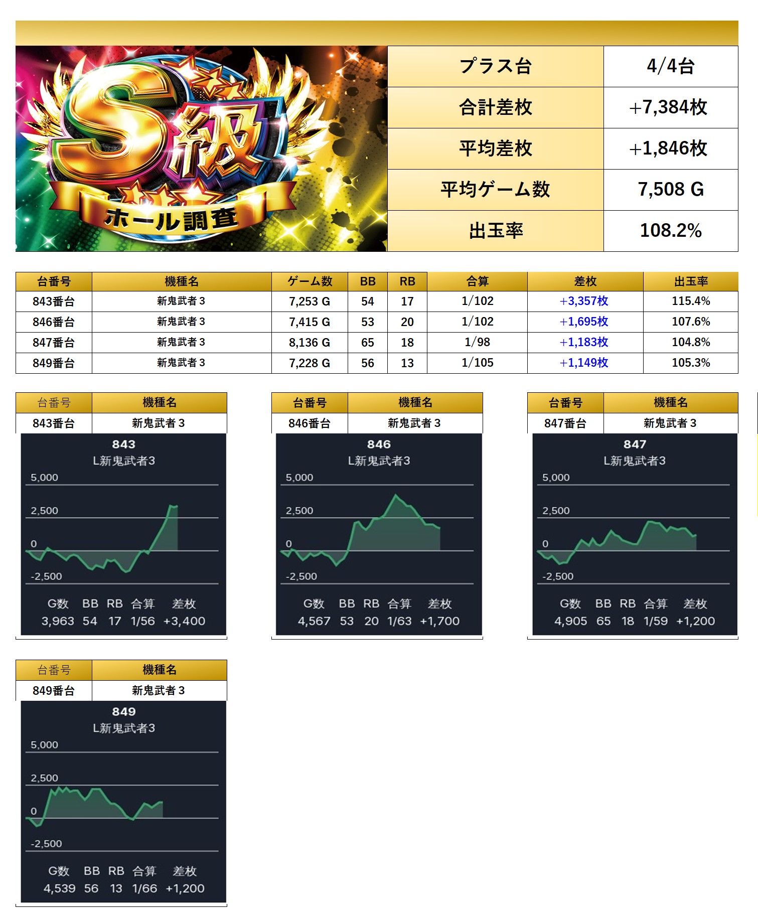 4台以上設置機種から優秀台を探すと4台をpick upすることができた。4台の平均差枚は+1,846枚で平均出率が108.2%と「新鬼武者3」がpick upされていた。