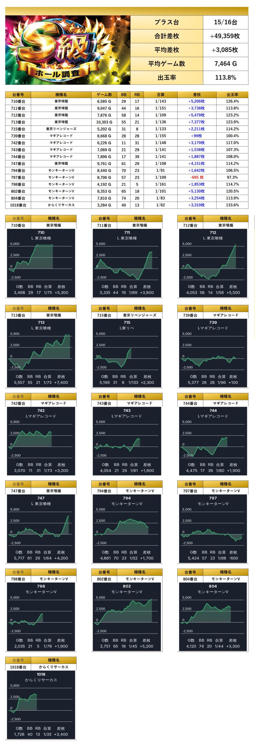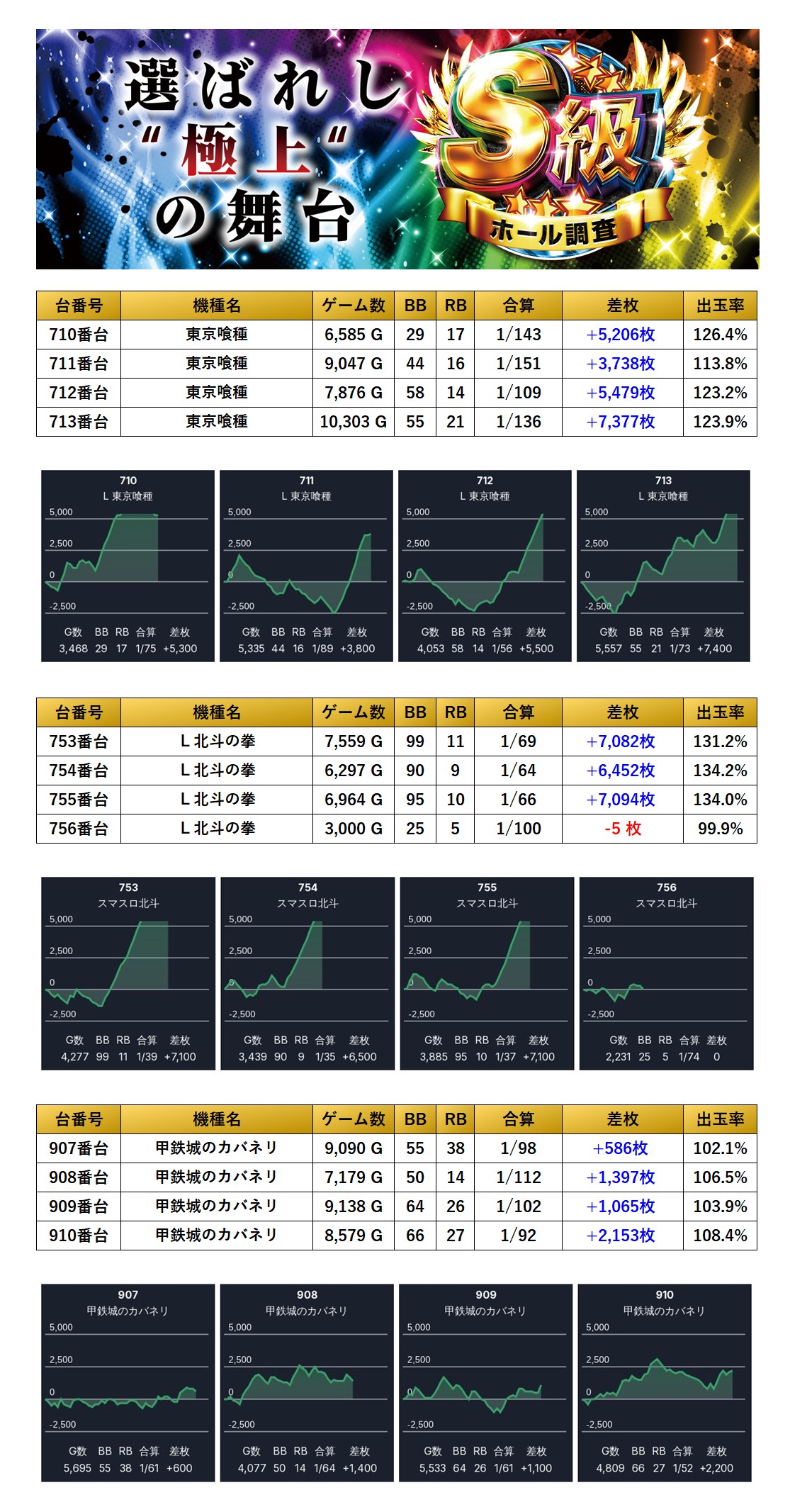「東京喰種」「東京リベンジャーズ」「モンキー」「マギレコ」「からくりサーカス」の5機種から16台の優秀台をpick upする。16台の平均差枚は+3,085枚で平均出率が113.8%とメイン機種らしいポテンシャルを見せた。