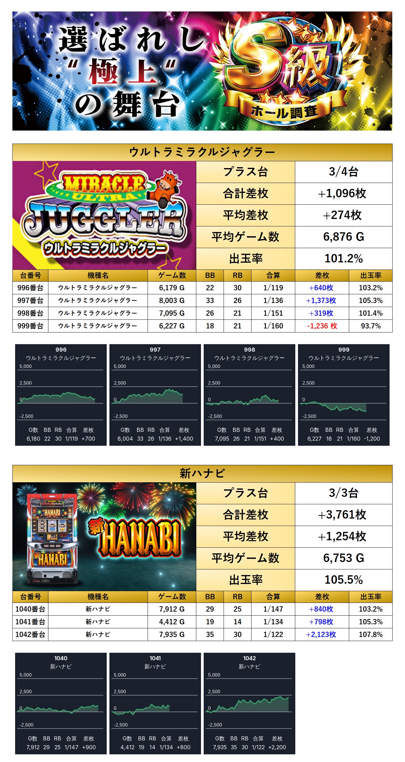 「ウルトラミラクルジャグラー」「新ハナビ」の2機種をpick upする。2機種7台の平均差枚は+694枚で平均出率が103.1%と安定した出率を確保していた。