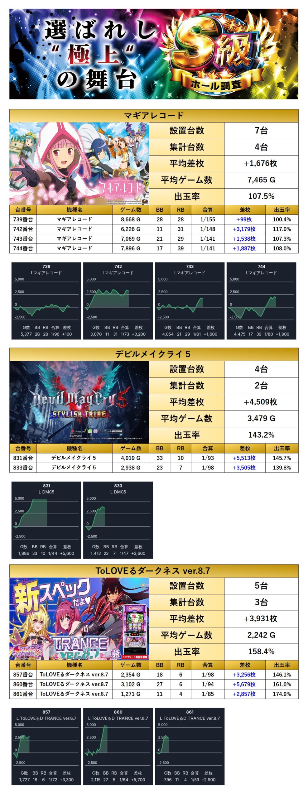 メイン機種でも紹介した「マギレコ」さらには「デビルメイクライ5」「ToLOVEるダークネス ver.8.7」の3機種をpick upする。3機種9台の平均差枚は+3,057枚で平均出率が121.1%とホール全体の出玉感をさらに押し上げた。