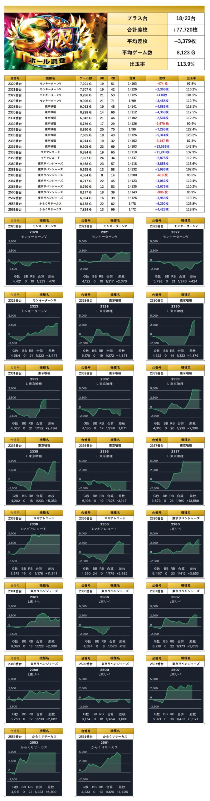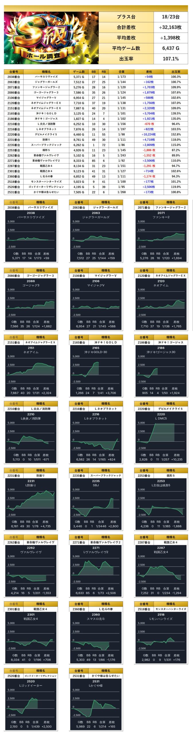 4台以上設置機種から優秀台を探すと23台もpick upする事ができた。23台の平均差枚は+1,398枚で平均出率が107.1%と多彩な仕掛け量だった。