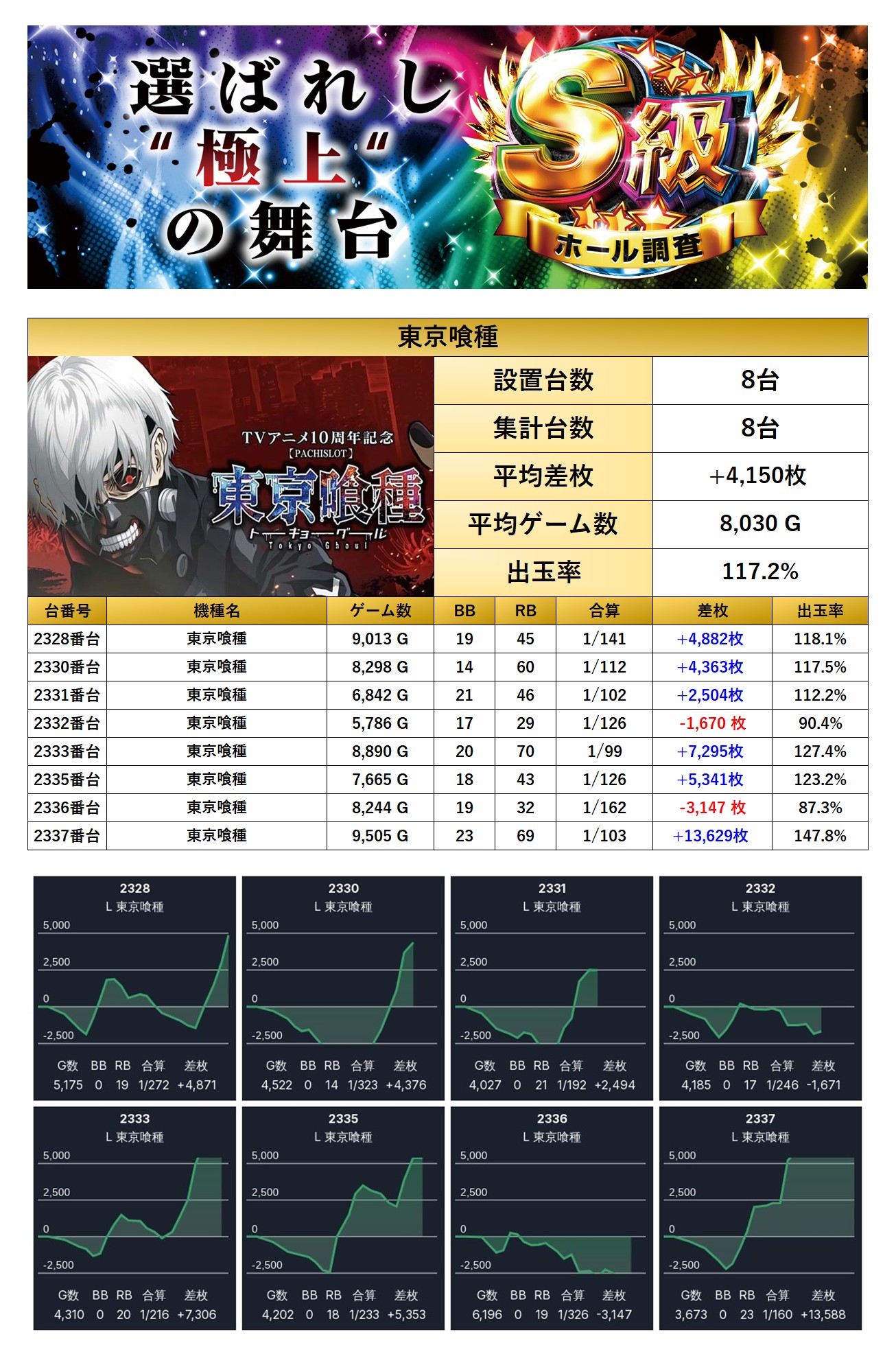メイン機で紹介した「東京喰種」の1機種をpick upする。1機種8台の平均差枚は+4,150枚で平均出率が117.2%と万枚OVERの台も確認でき、素晴らしい結果だった。