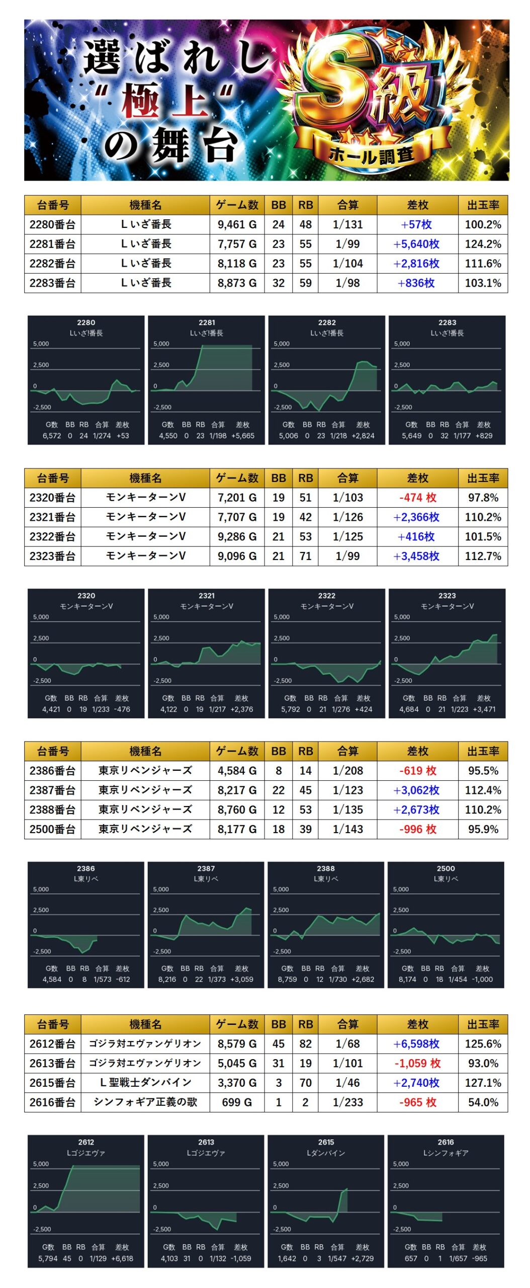 「東京喰種」「モンキー」「からくり」「マギレコ」「東京リベンジャーズ」の5機種から優秀台を23台をpick upする。