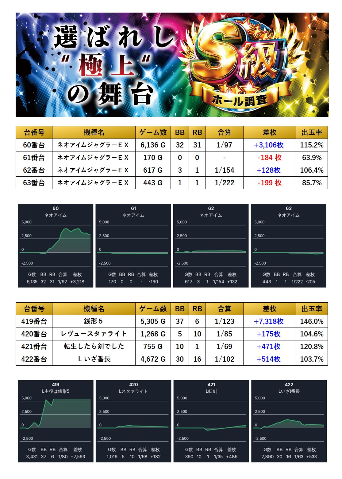 平均差枚は圧巻の+6,292枚、出率128.1%とメイン機種らしいインパクトのある仕掛けとなった。