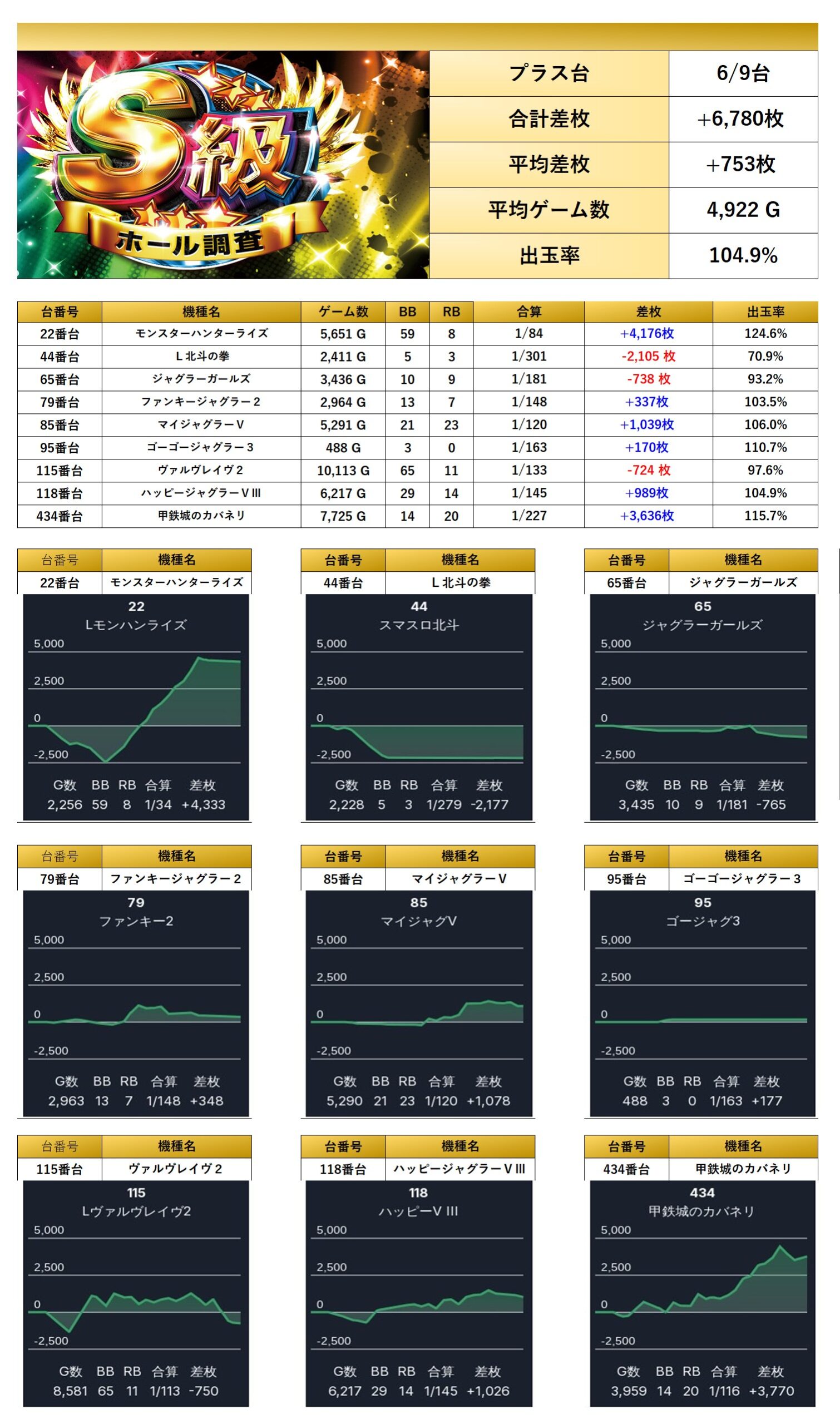 4台設置機種からも9台がピックアップされ、平均差枚+753枚、出率104.9%となった。