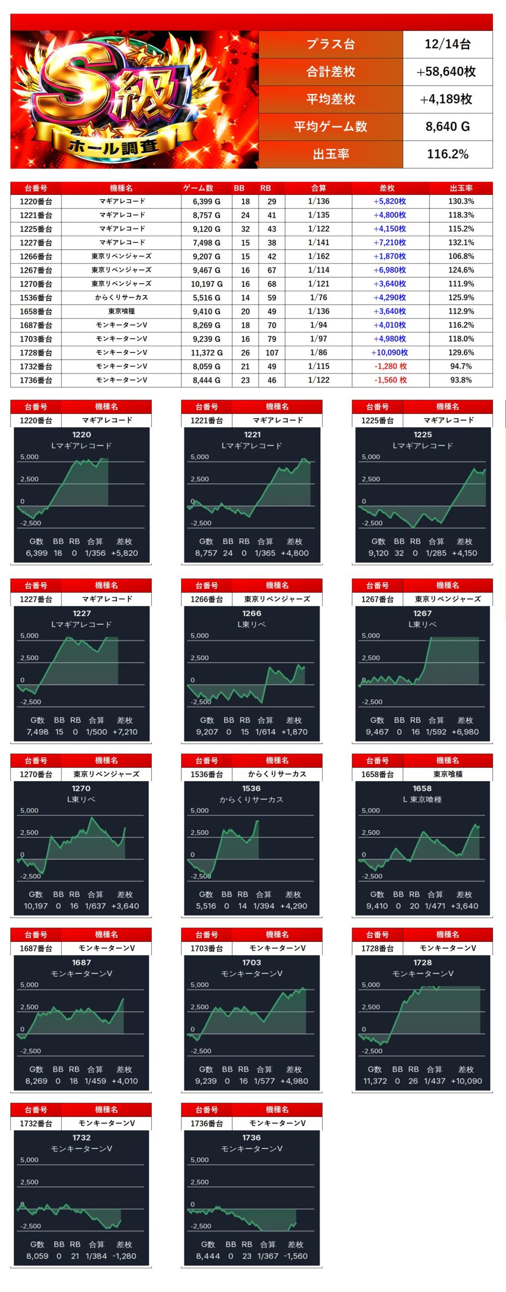 「東京喰種」「モンキー」「マギレコ」「東京リベンジャーズ」「からくり」から優秀台を14台pick upする。14台の平均差枚は+4,189枚で平均出率が116.2%。