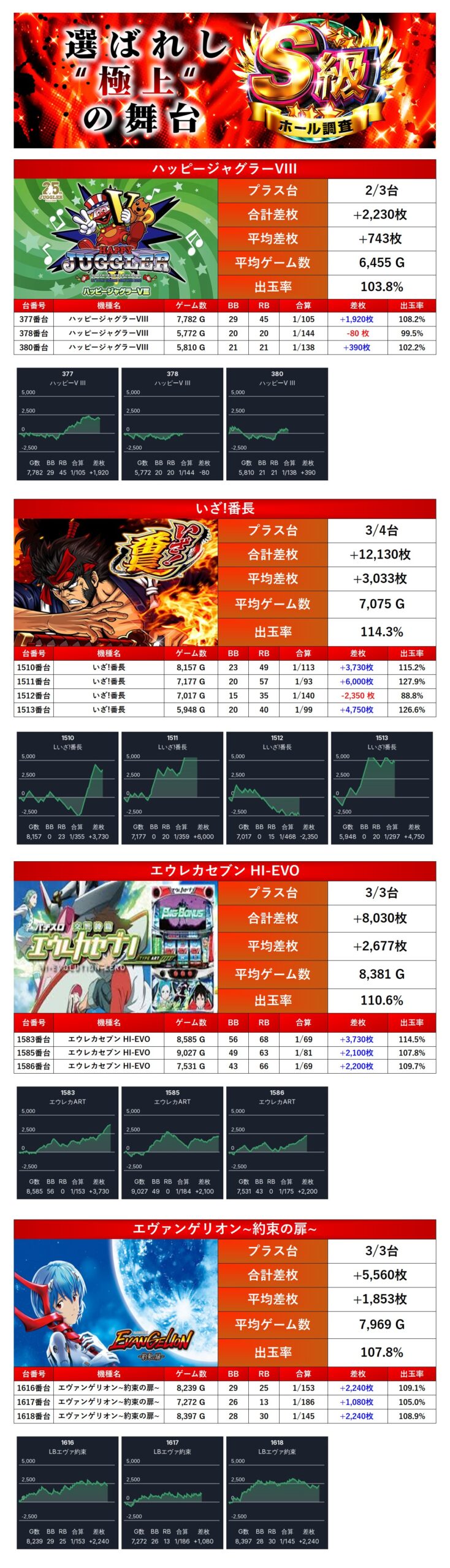 「ハッピージャグラー」「いざ!番長」「エウレカセブン HI-EVO」「エヴァンゲリオン~約束の扉~」の4機種をpick upする。4機種13台の平均差枚は+2,150枚で平均出率が109.6%だった。