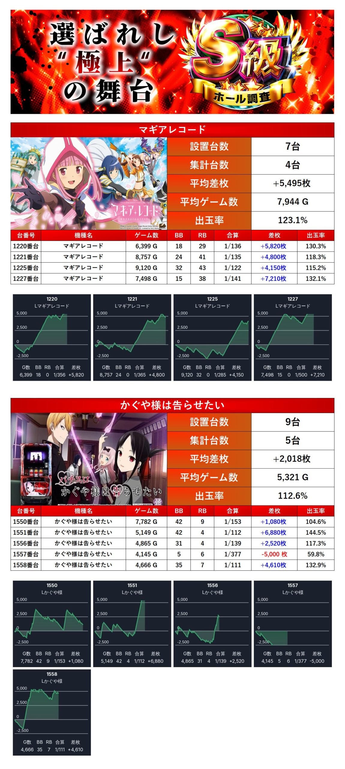 メイン機種でも紹介した「マギレコ」に加え「かぐや様は告らせたい」の2機種をpickupさせてもらう。2機種9台の平均差枚は+3,563枚で平均出率が118.3%だった。