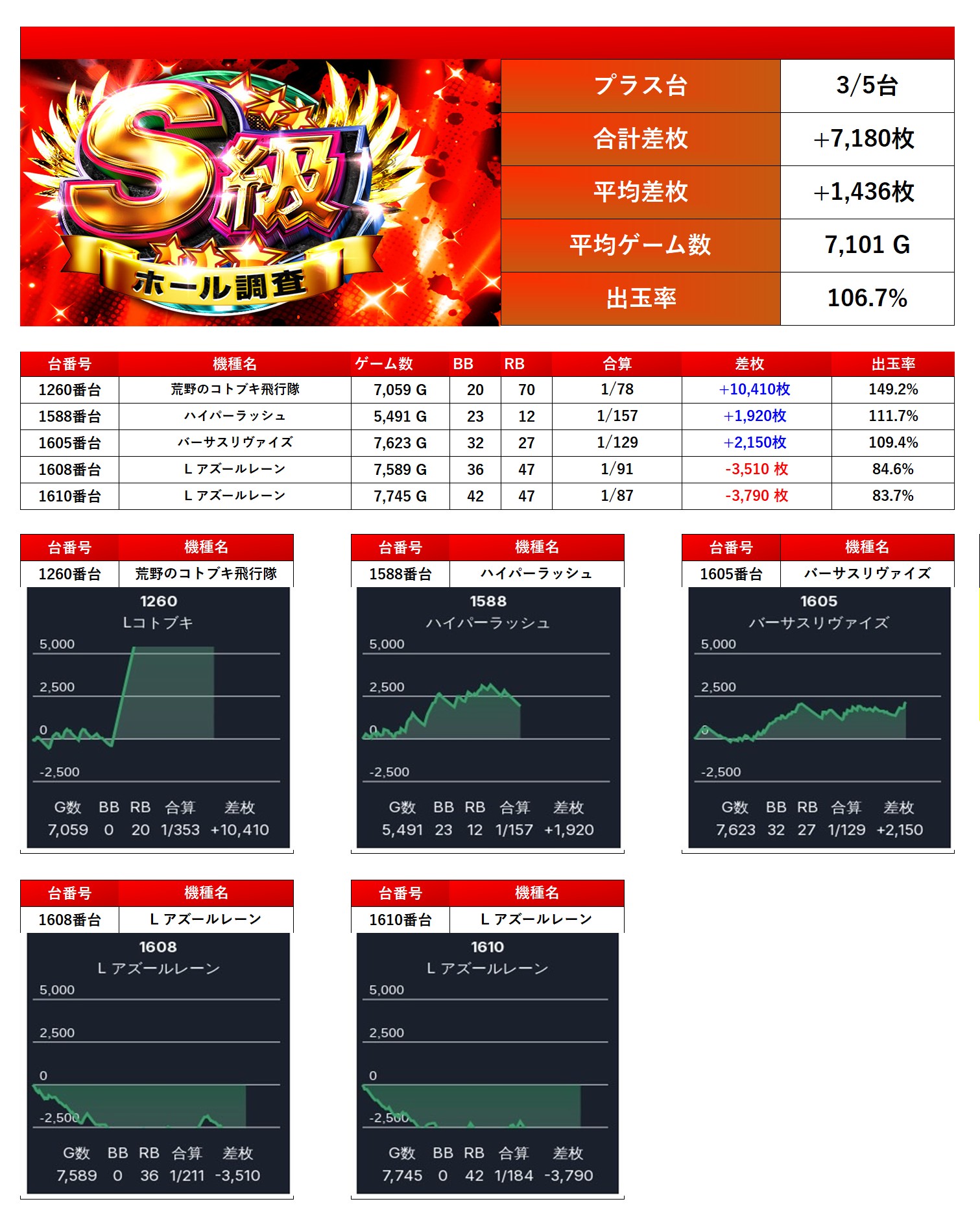 対象から5台をpick upする。5台の平均差枚は+1,436枚で平均出率が106.7%だった。