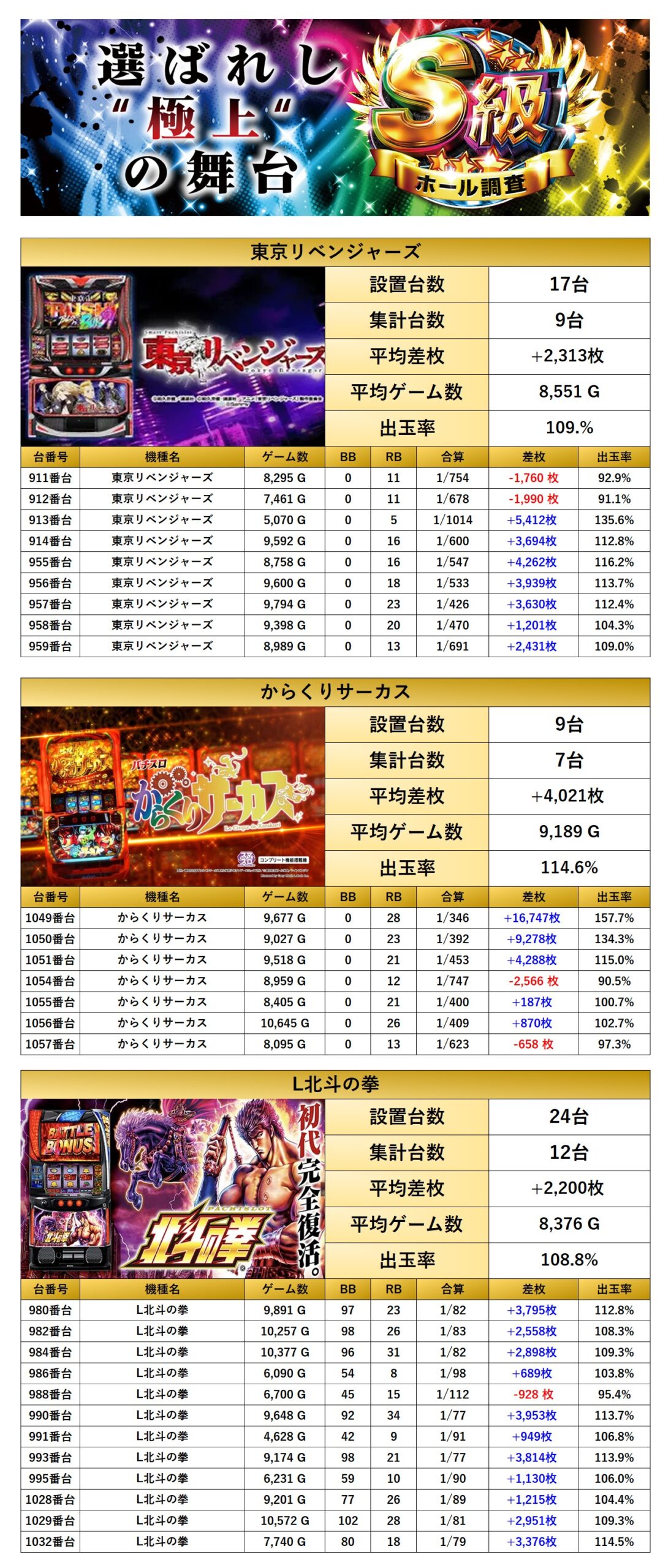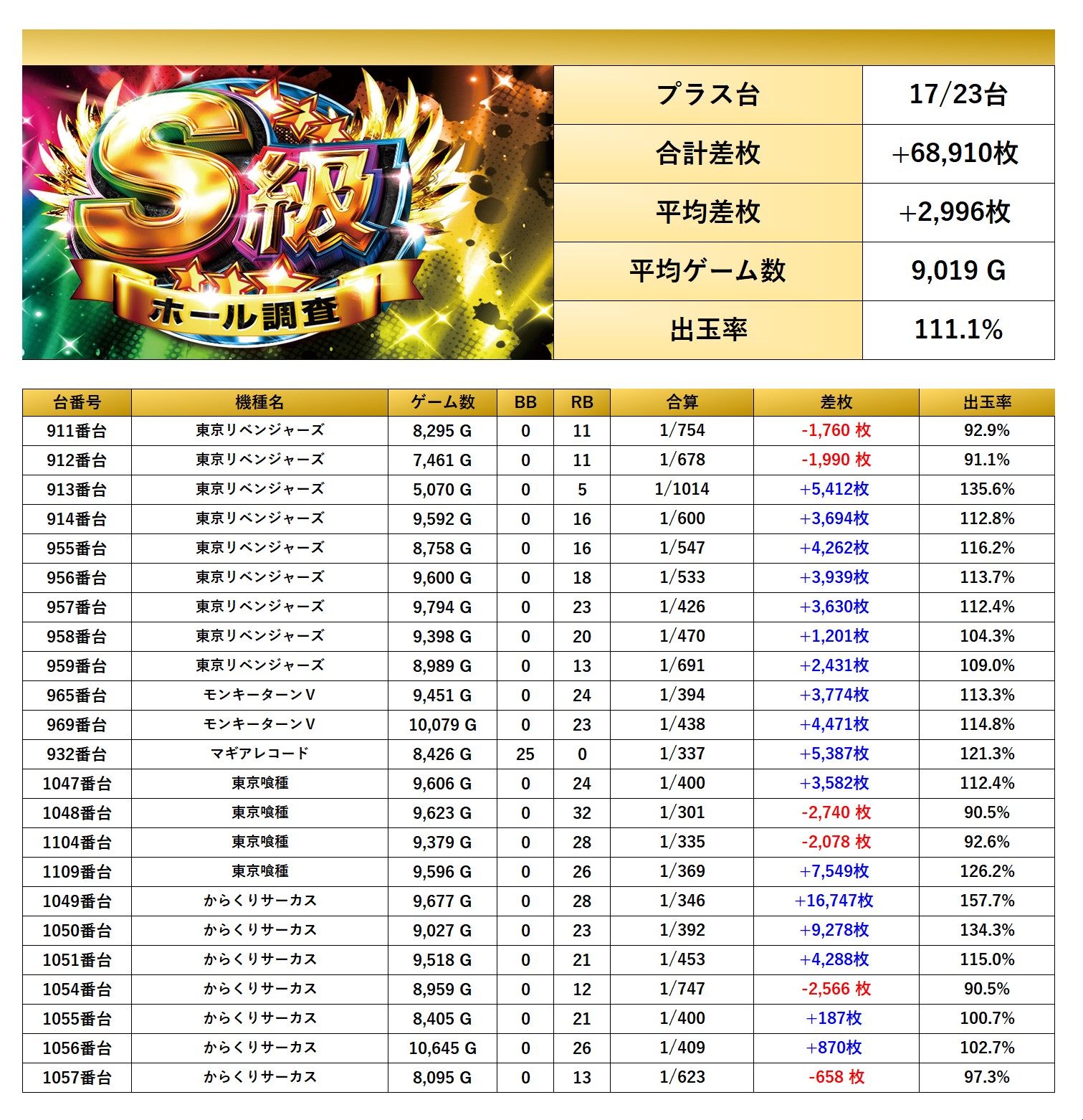 平均差枚+2,996枚、平均出率111.1%となった。多数の台がしっかり打ち込まれており、万回転が2台もあり、平均ゲーム数が9000G超えと勝率も素晴らしい結果に。