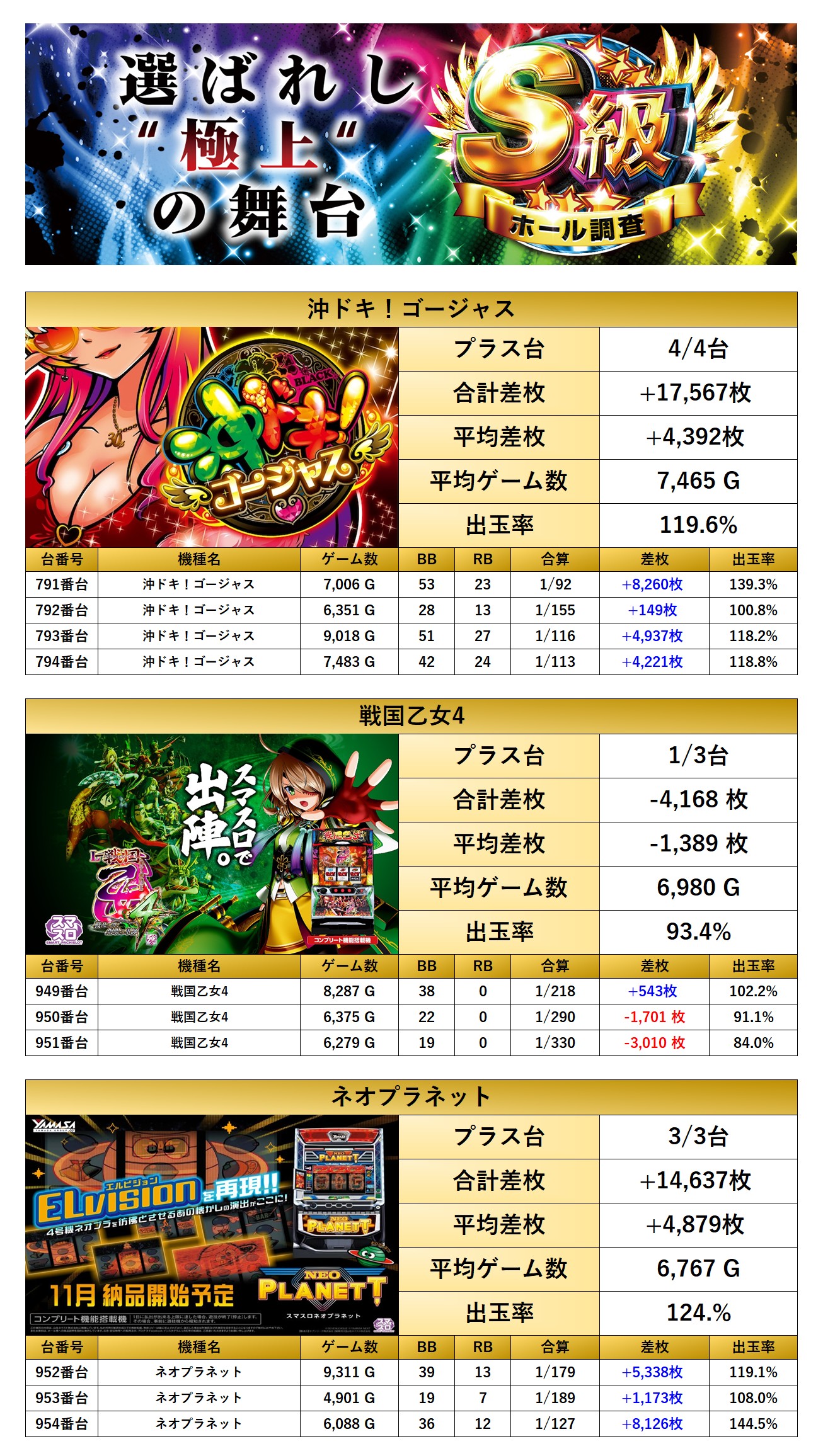 8回目となったS級‐虹‐は朝から抽選320名/一般142名と設置台数を超えるユーザーが集まってくれた。今回のpick up率は21.4%と圧巻の仕掛け量になっていた。特に目を引かれたのは「メイン機の仕掛け」から質と勝率の高さが素晴らしい。さらに全台系ではノーマル機の出率が驚愕の113%と好成績を叩き出した。店内全体で総差枚+240,903枚/平均+639枚と驚きの結果に。店内はお祭り騒ぎとなり「強い」の一言。堂々と不足なしの三つ星にふさわしい一日となった。今回で3連続で三つ星獲得となった。次回の調査でも期待が膨らむ。