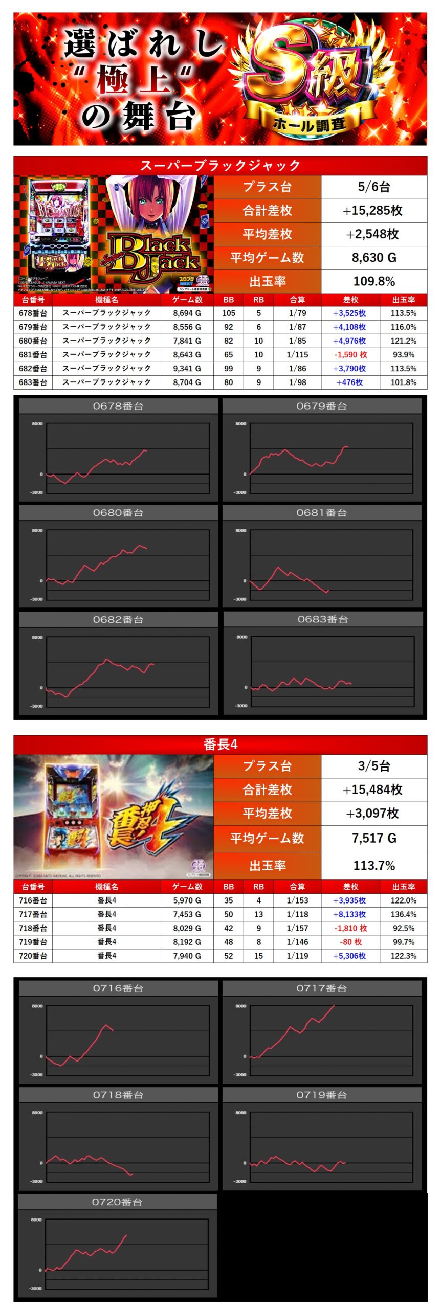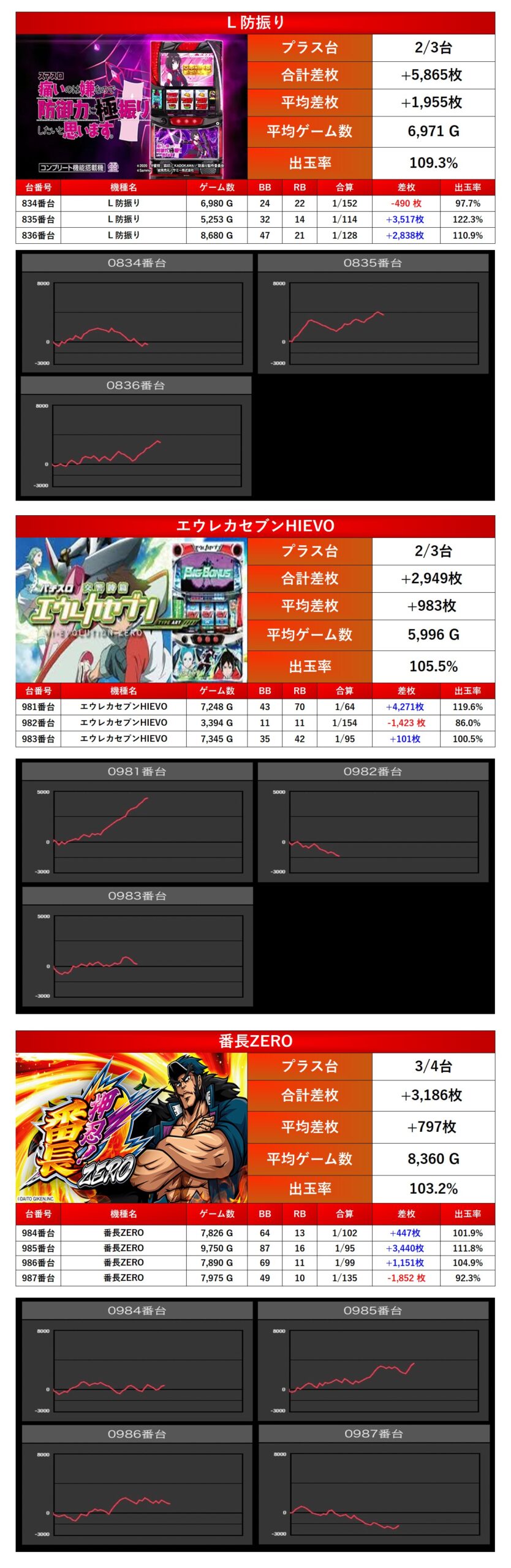「スーパーブラック」「番長4」「防振り」「エウレカ」「番長ZERO」といった4機種21台がピックアップされた。