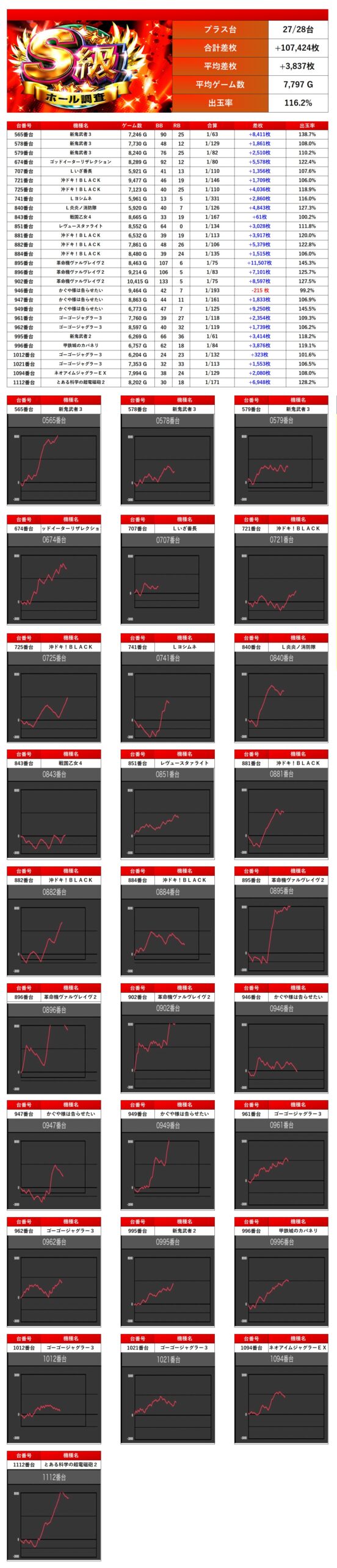 各所から計28台をpick upし、平均差枚+3,837枚/出率116.2%を記録。散発的に強烈な出玉を生み出し、全体の出玉感をさらに底上げしていた。