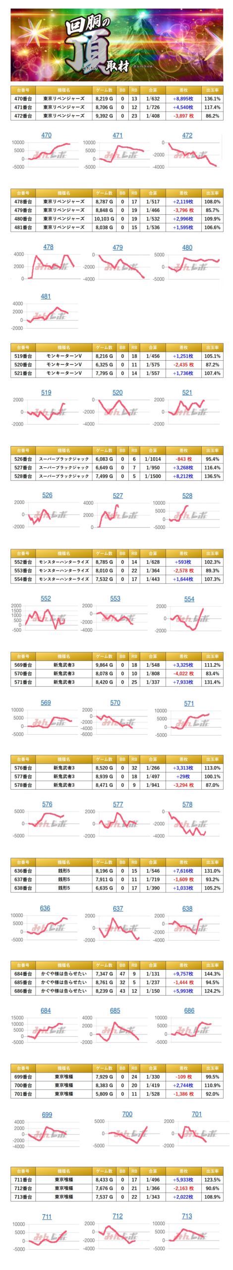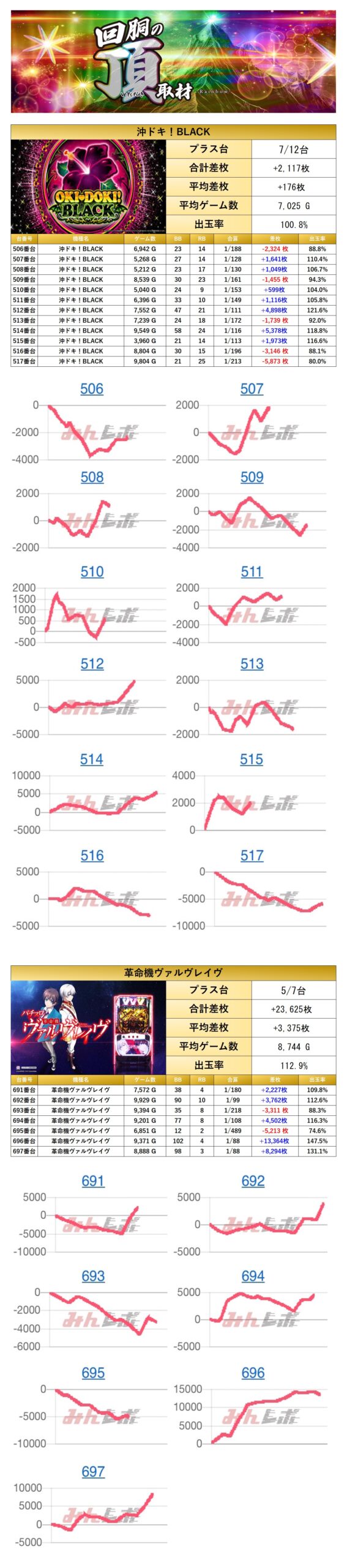 「沖ドキ!BLACK」「ヴヴヴ」の2機種をpick upする。2機種の平均差枚は+1,355枚で平均出率が105.9%だった。