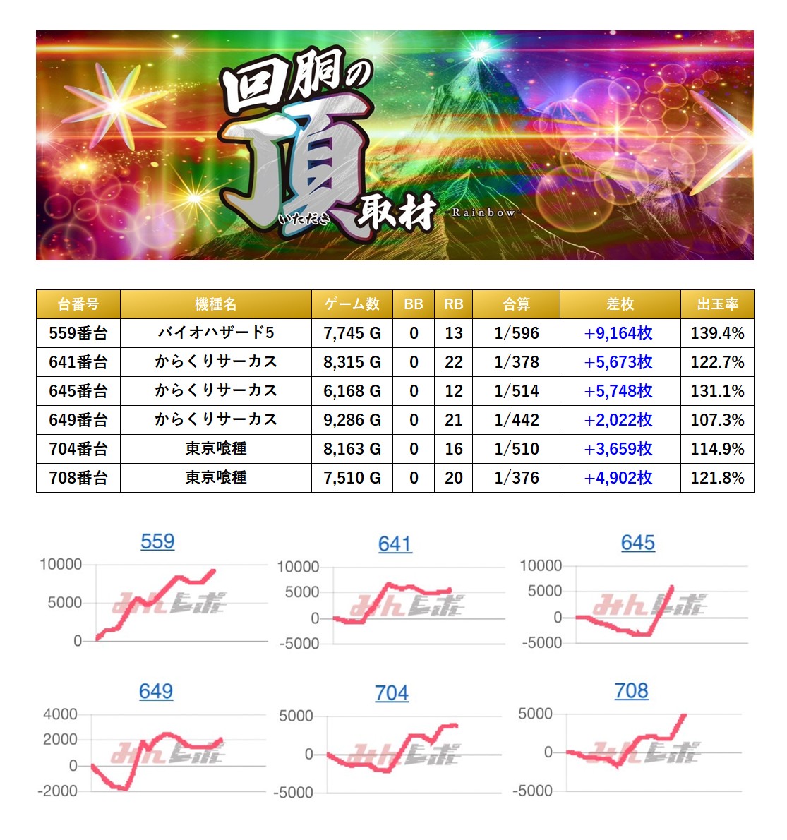 対象から6台をpick upする。6台の平均差枚は+5,195枚で平均出率が122.0%だった。