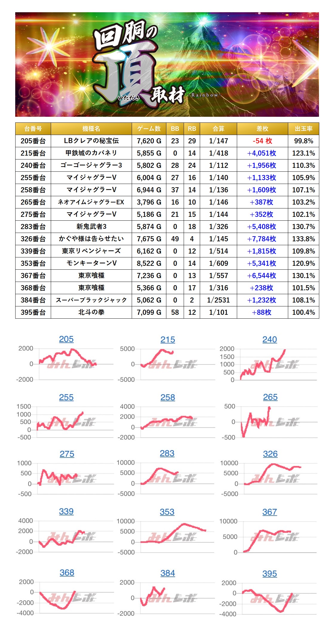 メダル機、スマスロから15台をpick upする。15台の平均差枚は+2,526枚で平均出率が113.0%だった。