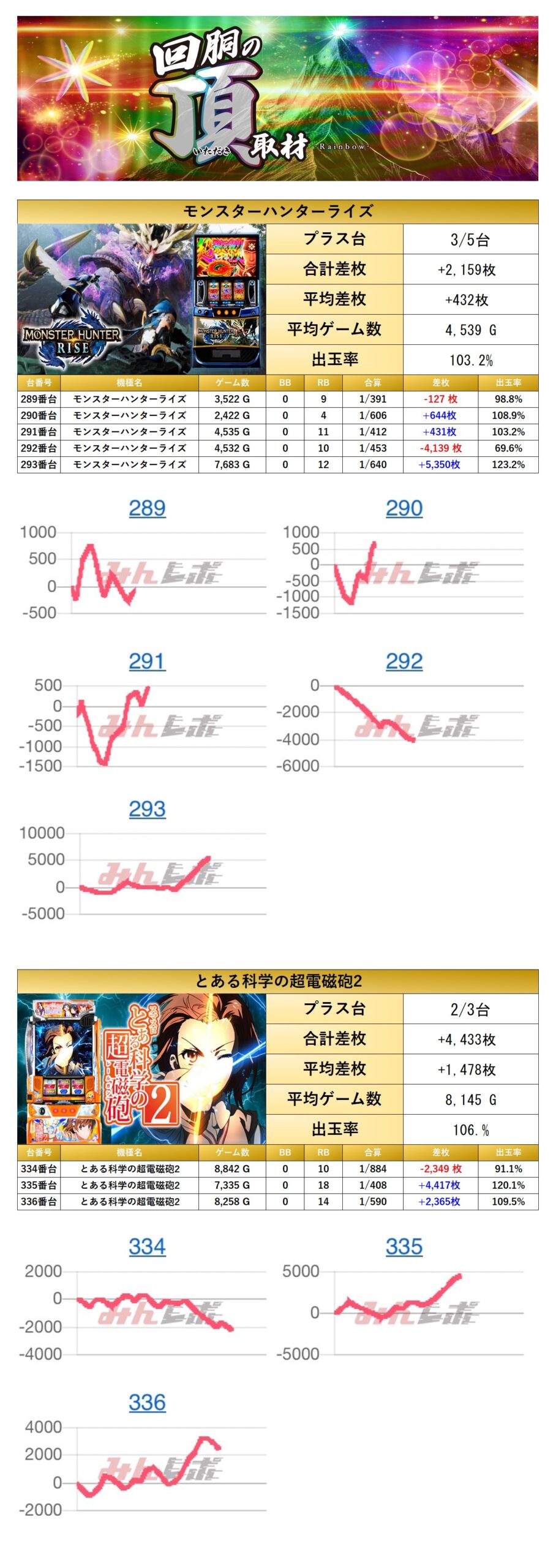 「モンハンライズ」「とある科学の超電磁砲2」の2機種をpick upする。2機種の平均差枚は+824枚で平均出率が104.7%だった。