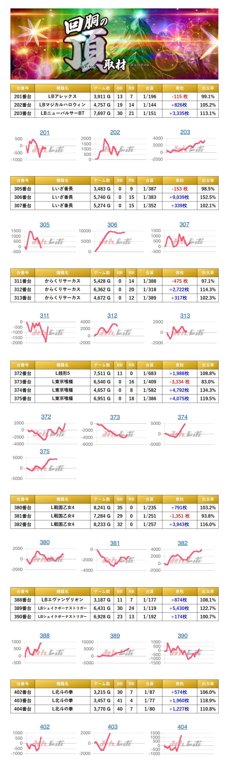 3台並びを6箇所、4台並びを1箇所の計7箇所見つけることができた。平均差枚は+1,681枚で平均出率が109.6%だった。